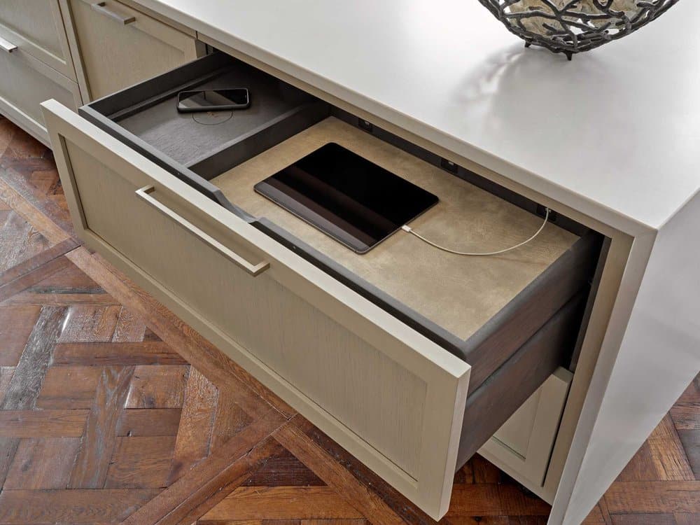 Bespoke charging drawers are crafted to provide a dedicated space for all your devices, from smartphones and tablets to smartwatches and e-readers, eliminating countertop clutter and ugly wires and cords. Our bespoke designs blend effortlessly with our iconic luxury cabinetry, offering elegantly concealed outlets, USB ports, and wireless charging pads for unparalleled ease of access. Every detail is thoughtfully crafted to bring power to your fingertips while preserving the aesthetic of your interior design.