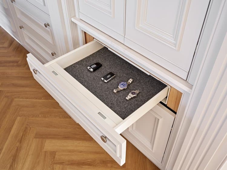 Security is a paramount consideration for high-net-worth individuals, and our design team ensures that this priority is seamlessly integrated into every project. One solution we offer is the installation of integrated safe drawers, discreetly embedded within cabinetry in key areas such as dressing rooms, bedrooms, or kitchens. These state-of-the-art safes are equipped with advanced fingerprint sensor technology, providing both ease of access and exceptional security. Perfect for safeguarding everyday valuables—such as car keys, wallets, and personal devices—these integrated drawers offer an elegant and unobtrusive solution.