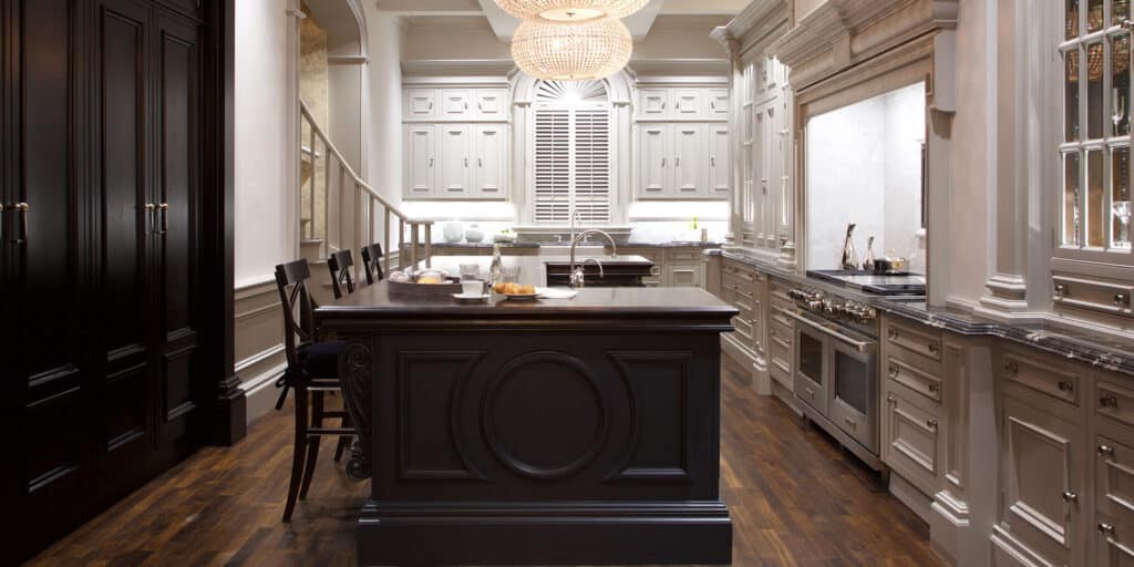 The most significant and striking feature of the Architectural kitchen is the dramatic, over-sized island, topped by two magnificent chandeliers. No other company had previously had the vision or bravery to introduce such elements, and they have subsequently become the signature of Clive Christian Furniture.