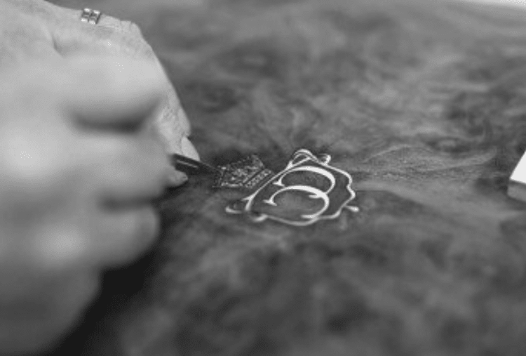 The marquetry team do incredible work, which is highly specialist – very few people in the country can do it. We’re able to offer bespoke imprints, such as family crests, using different colours and types of wood. We created a large sunflower and a Manchester working bee in marquetry for one of our clients. For a client in Edinburgh, we recreated Degournay wallpaper in marquetry on a bathroom cabinet, and we depicted a beautiful racing car on a kitchen mantle for a motoring enthusiast in Weybridge.