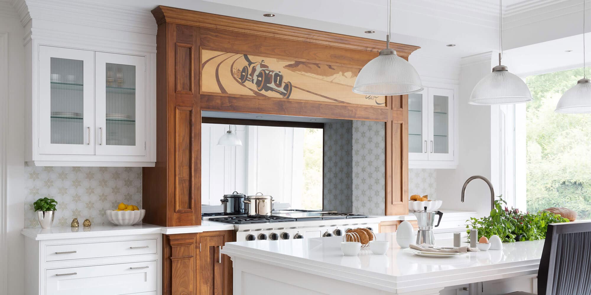 One of my favourite projects was the kitchen mantle that we designed for Alec Wilson, owner of our Weybridge showroom. Alec has always had a love of motor sport and wanted something to celebrate the historic Brooklands Racing Circuit – the birthplace of The British Grand Prix and a local piece of motorsport heritage.