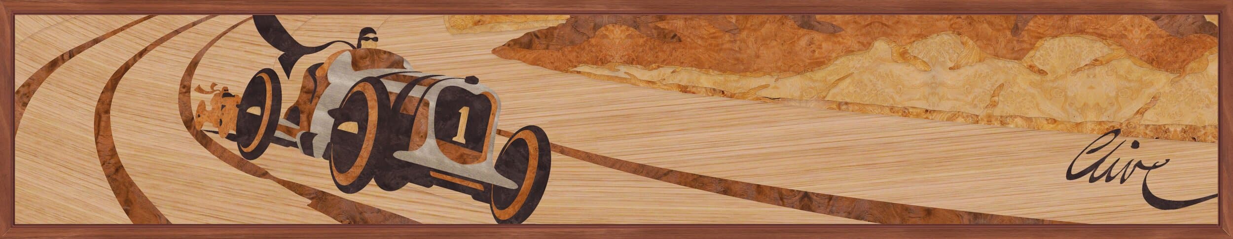 After extensive research, we designed an Art-Deco inspired illustration immortalising the Napier-Railton, driven by John Cobb. The design shows the record breaking car defying gravity as it grapples with Brooklands’ trademark soaring embankments. The panel was crafted using seven different varieties of veneer, all synonymous with interiors of classic British motor cars, and the end result looks fantastic.”