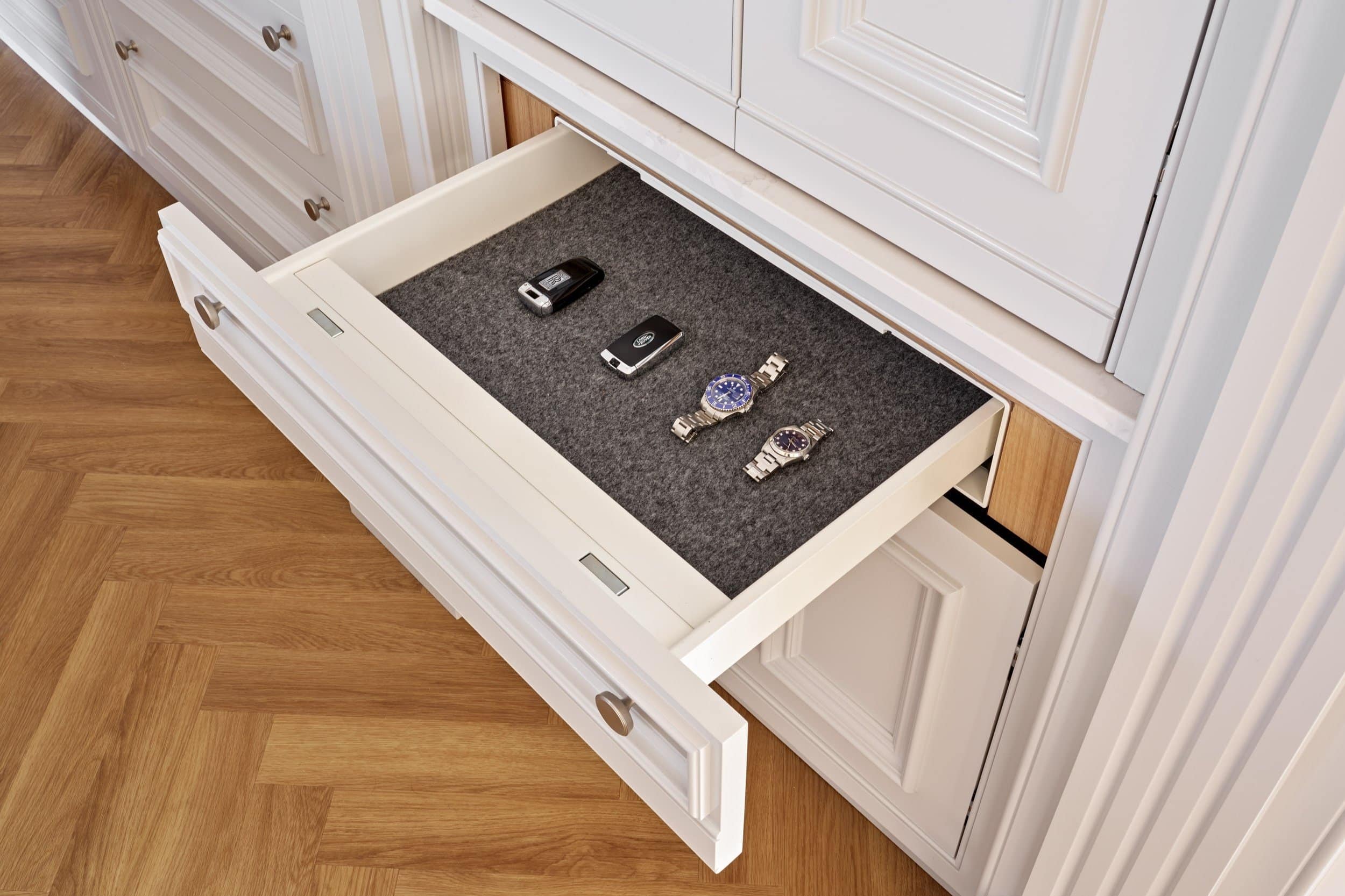 Security plays a part too: kitchens and living spaces can include discreet drawer safes for car keys, watches and other valuables. Our designers use special lining materials to prevent key cloning while charging drawers let you juice your devices while keeping them out of harm’s way (and temptation’s reach).