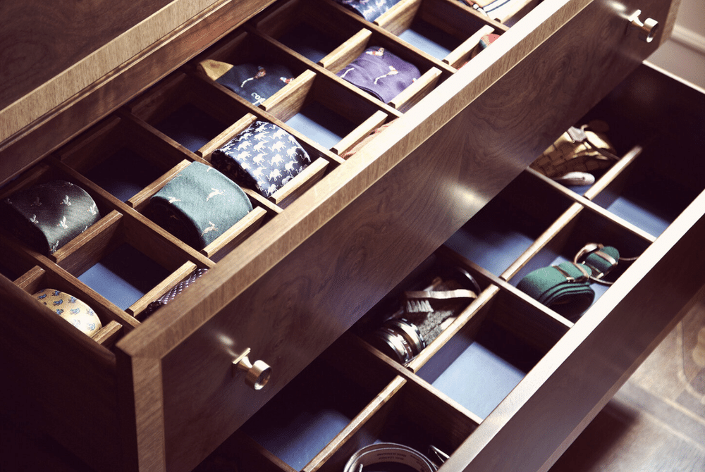 Another project featured hat storage with turned walnut stands, a grooming drawer, a deep drawer ‘dry bar’ with removable tray and compartmental storage, and ample space to house polished Oxfords and starched shirts.