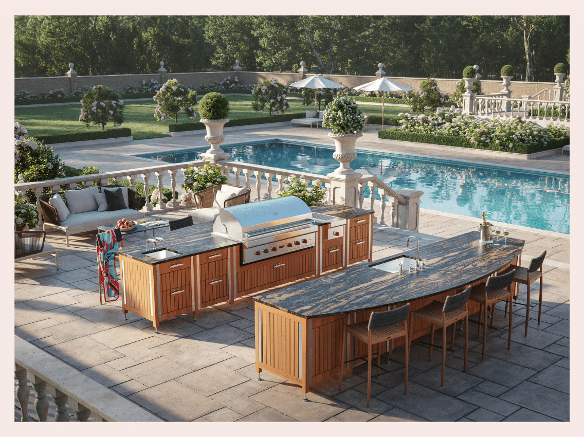 BAR STOOLS Each of the islands has space for four bar stools positioned around the edge, allowing guests to keep an eye on the action. These Gloster stools are made from Indonesian teak, which elegantly complements the cabinetry.