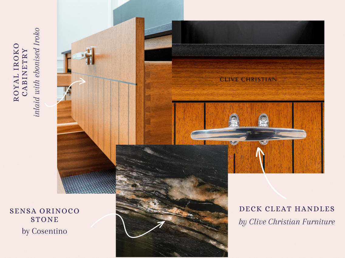 CABINETRY: Royal Iroko cabinetry is inlaid with ebonised Iroko to recall the distinctive pinstriped deck of a yacht. This striking effect showcases Clive Christian Furniture’s expertise in marquetry. The hardwearing finish is further protected by a UV lacquer.