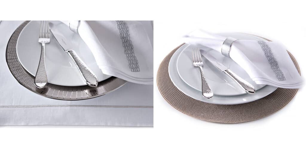 Make subtle changes with your charger plate or placemat. Swapping out luscious linen for a luxurious, textured, circular placemat can completely change the design as seen in our ‘Cobra’ GF collection below. Equally, changing your charger plate to a white-on-white version is an easy way to completely change the look of your table setting and highlight your accompanying table accessories.