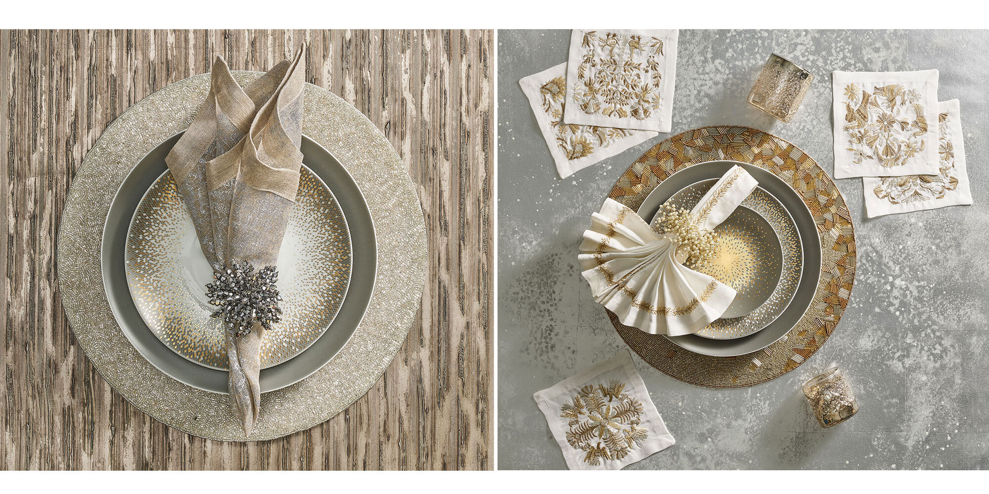 Napkins & Napkin rings are a great way to differentiate and make a statement. For festivities, we love Kim Seybert’s stunning tabletop accessories. Showcased below in stunning metallic hue options, they add glamour to any table.