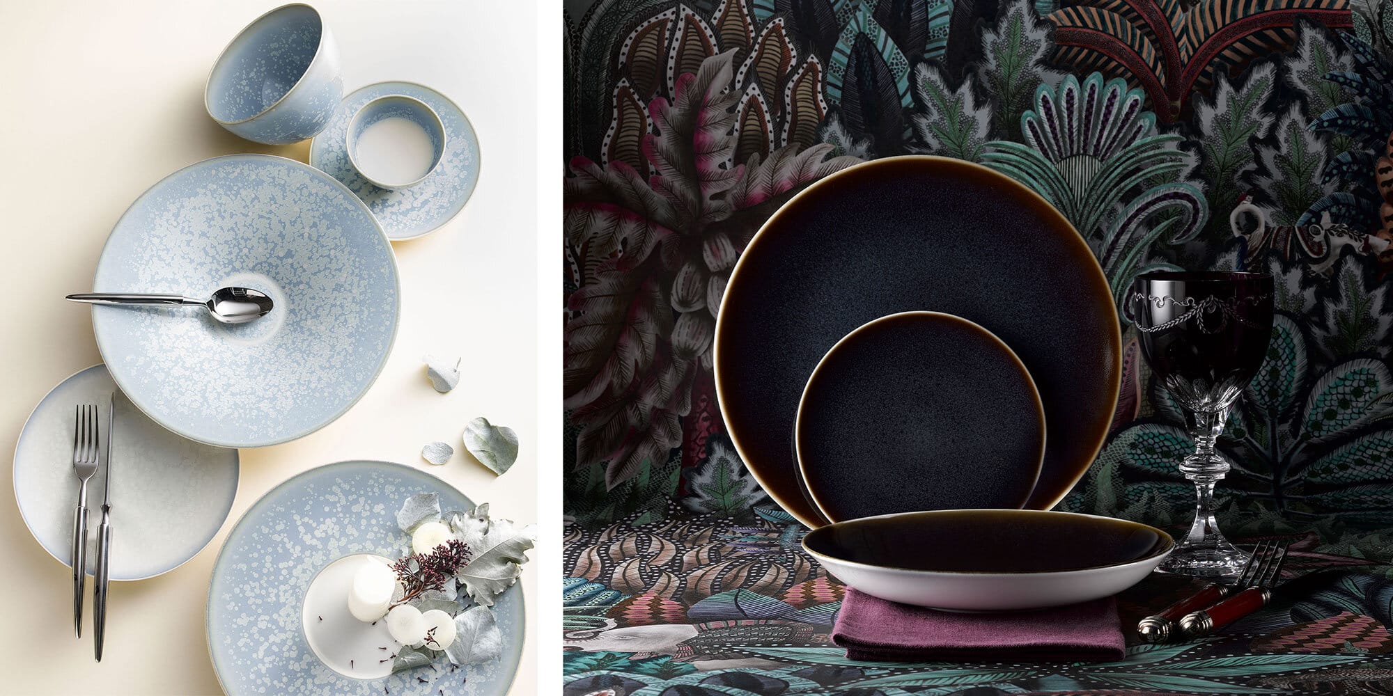 For a luxurious but more rustic table setting, we’d recommend creating your own winter wonderland. For this, texture is your best friend! Using precious metals, gems and handcrafted wooden pieces together, it gives the desired organic look but ensures elegance and class are retained. We would include the festive but timeless ‘Song’ collection by Jaune de Chrome with its incredible enamel work and soft, pastel coatings. Or the new ‘Art Glaze’ collection by Royal Crown Derby. Its artisan makers hand-spray a reactive glaze onto the fine-bone china body which, when fired, creates a unique, textured finish and striking colourway.
