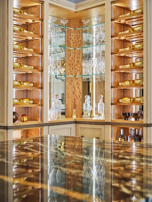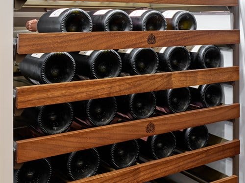 In order to facilitate these ideal conditions, Clive Christian’s bespoke cabinetry includes tilting shelves that allow bottles to be stored either horizontally or at an angle. This also makes them easier to access and allows collectors to display labels and foils, much as they would works of art.