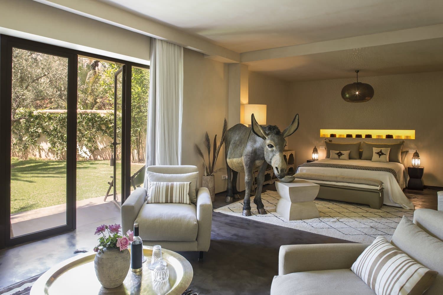 In Marrakech’s Palmeraie, the cool palm-grove oasis ten minutes outside the medina walls, you’ll find the Dar El Sadaka villa, which translates as the ‘House of Friendship’. This fully-staffed villa is the home of Jean-François Fourtou, the French visual artist known for his unique sculptures of animals. Set within Fourtou’s invitation-only sculptural park, the property is surreal: part-fabulous villa, part-unconventional art gallery.