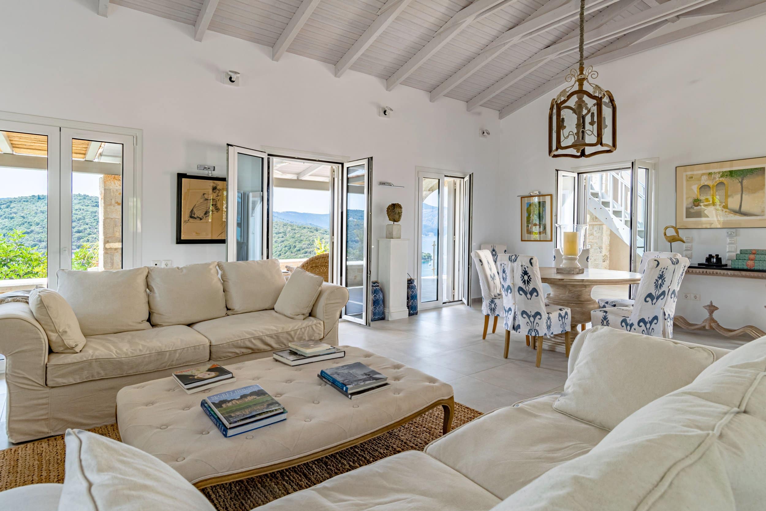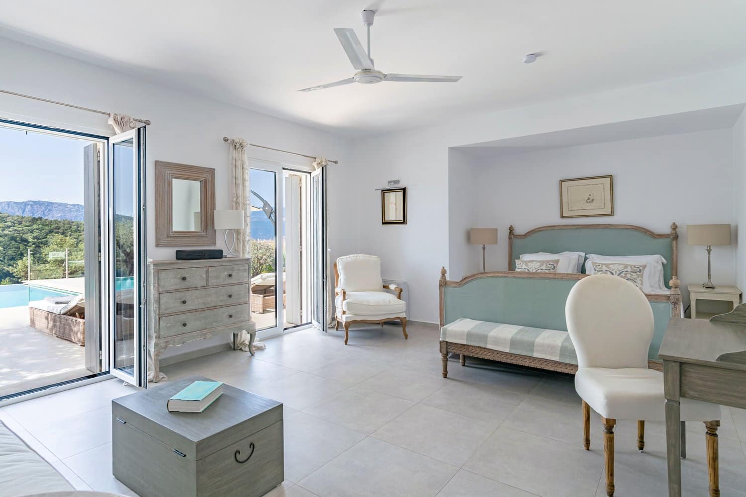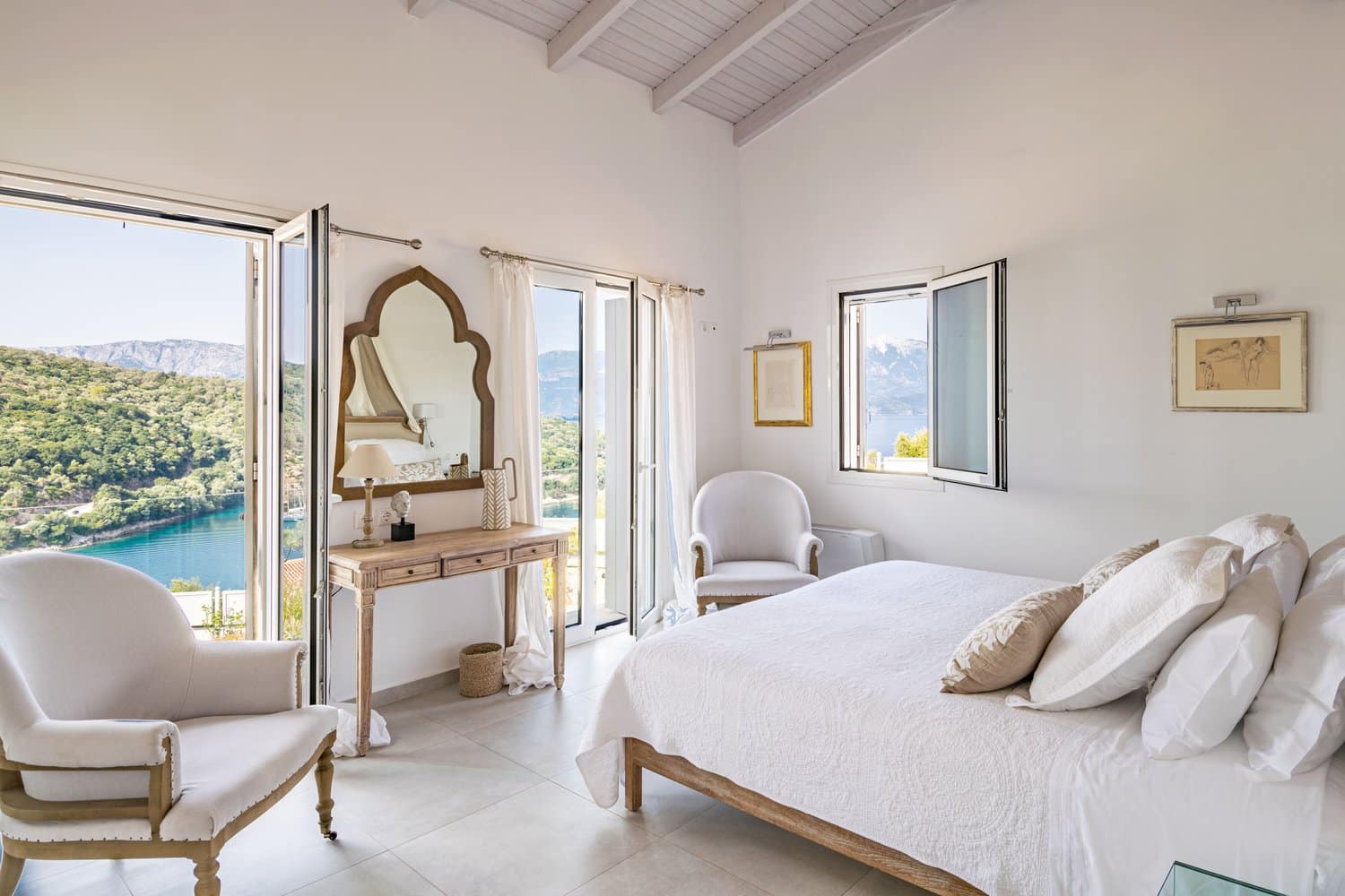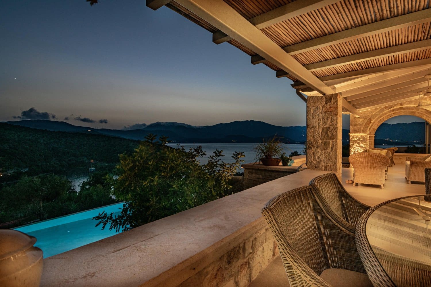 Occupying a secluding position high above the sea amongst the wooded hillsides, Aetheria inhabits a world all of its own. Sleeping ten across five bedrooms, the architecture nods to traditional island buildings with lofty beamed ceilings and exposed stone walls. There’s the living area, whose sofas and armchairs are gathered around a fireplace– and huge sliding glass doors lessen the distinction between interior and exterior spaces. Al fresco life revolves around the panoramic pool terrace, which is magnificent: set right in the middle of the infinity pool is a seating area and sunken fire pit. From here, it’s a short walk to the pool bar. Beyond the terraces framed with stone walls, is the owner’s estate which includes vineyards and the stables, which house the rare horses, including the golden Akhal-Teke from Turkmenistan (the oldest surviving equine breed and one of the rarest). The villa can arrange horse riding for guests. But just don’t expect the Akhal-Teke.