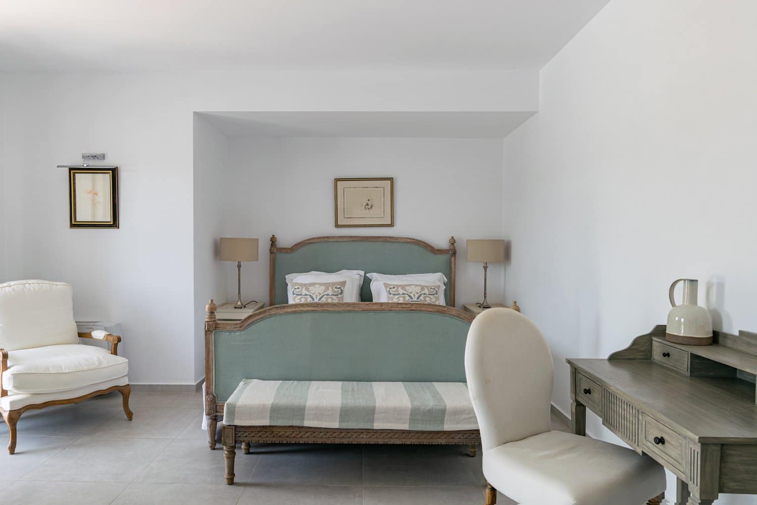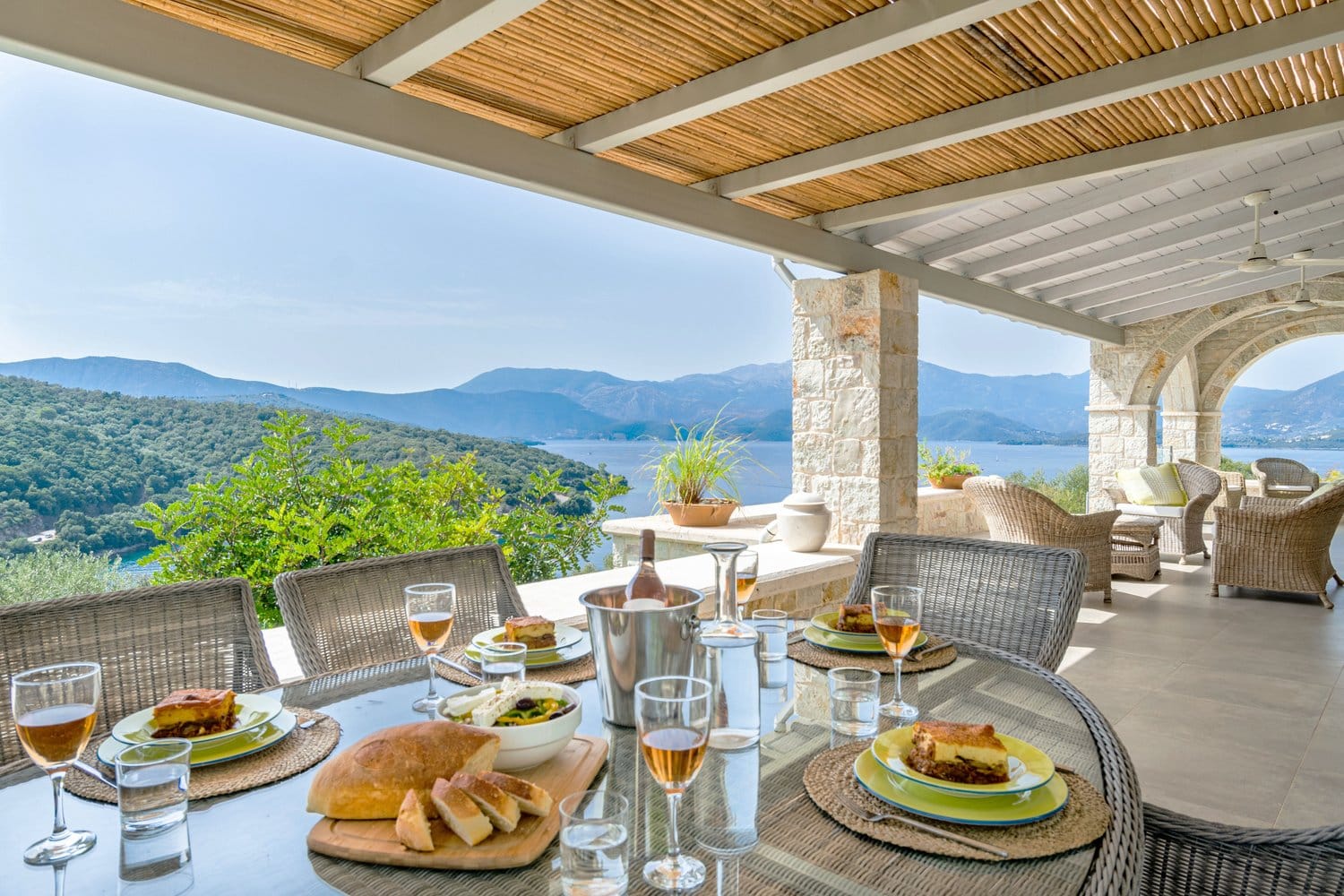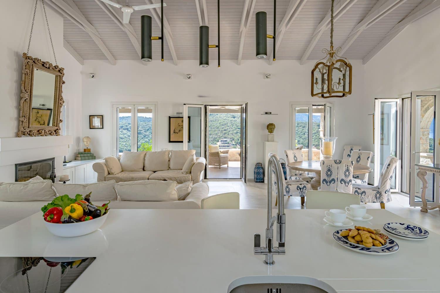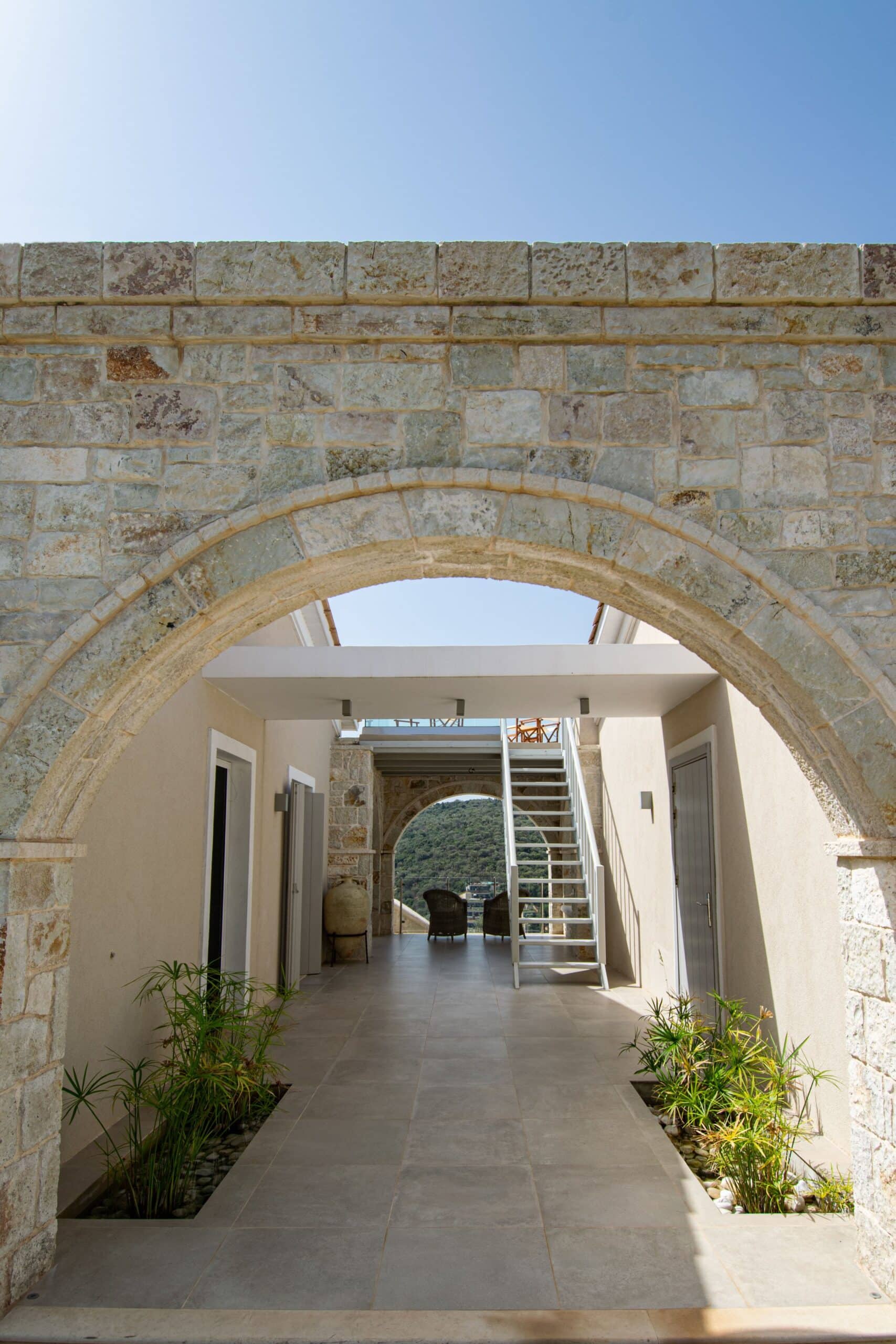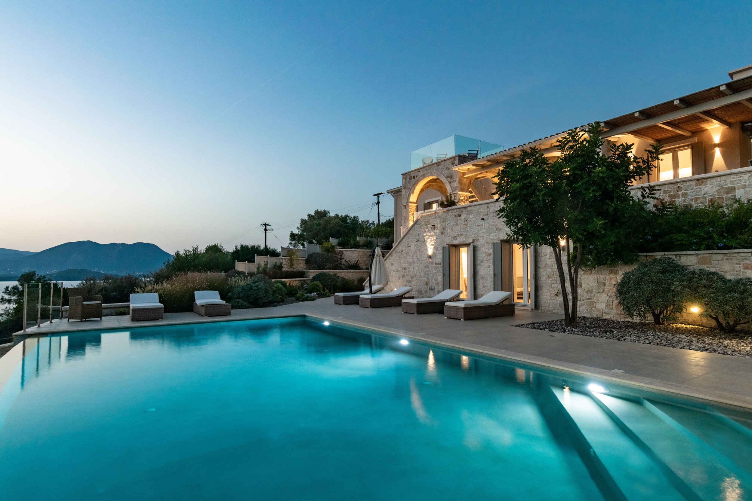 Occupying a secluding position high above the sea amongst the wooded hillsides, Aetheria inhabits a world all of its own. Sleeping ten across five bedrooms, the architecture nods to traditional island buildings with lofty beamed ceilings and exposed stone walls. There’s the living area, whose sofas and armchairs are gathered around a fireplace– and huge sliding glass doors lessen the distinction between interior and exterior spaces. Al fresco life revolves around the panoramic pool terrace, which is magnificent: set right in the middle of the infinity pool is a seating area and sunken fire pit. From here, it’s a short walk to the pool bar. Beyond the terraces framed with stone walls, is the owner’s estate which includes vineyards and the stables, which house the rare horses, including the golden Akhal-Teke from Turkmenistan (the oldest surviving equine breed and one of the rarest). The villa can arrange horse riding for guests. But just don’t expect the Akhal-Teke.