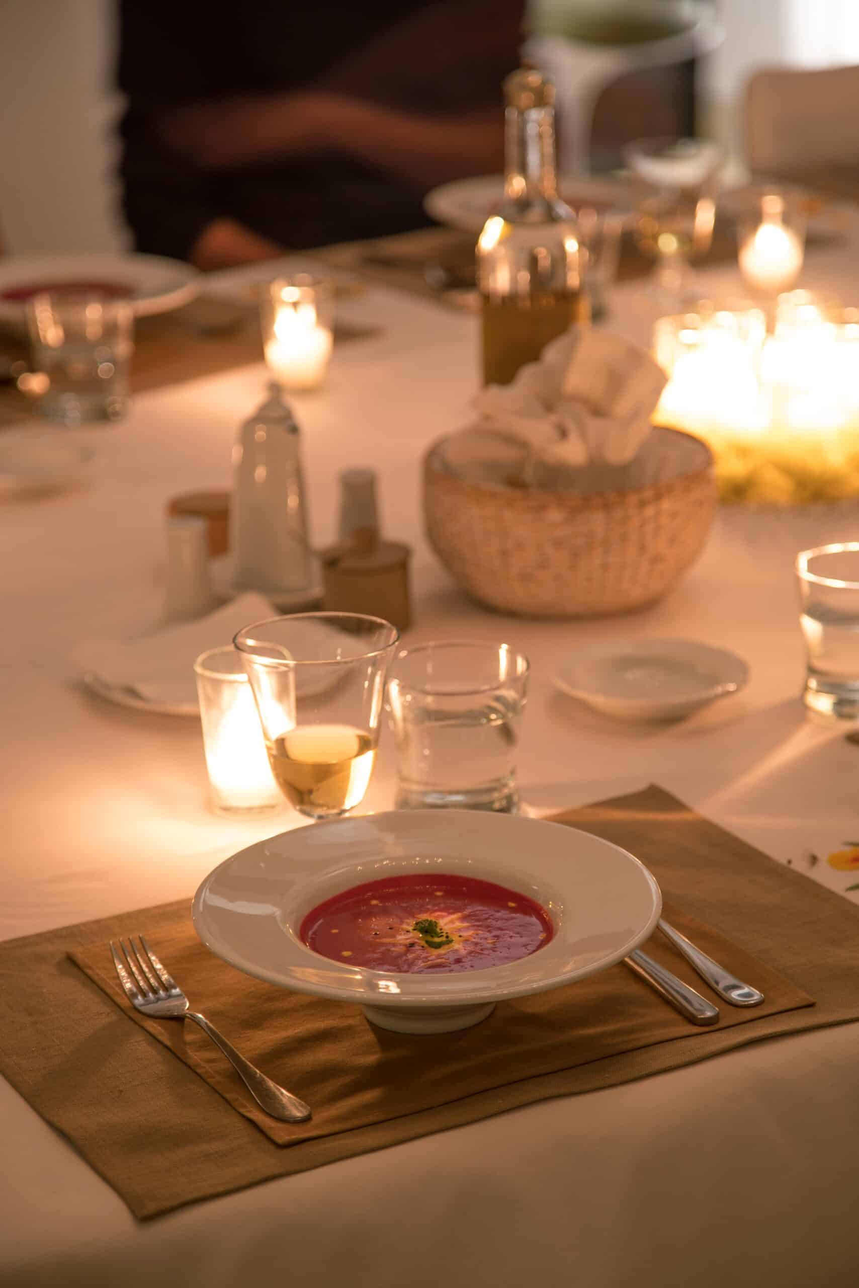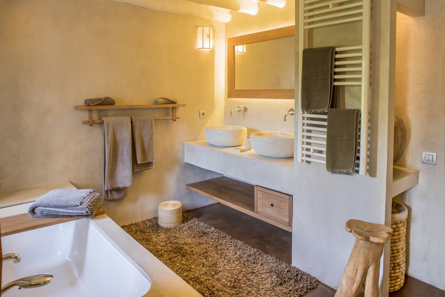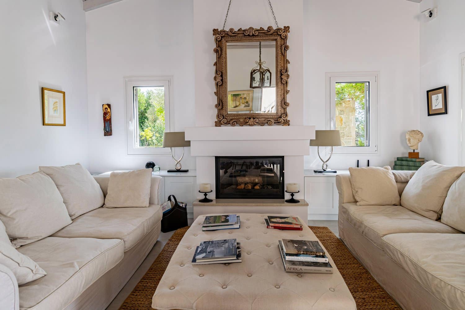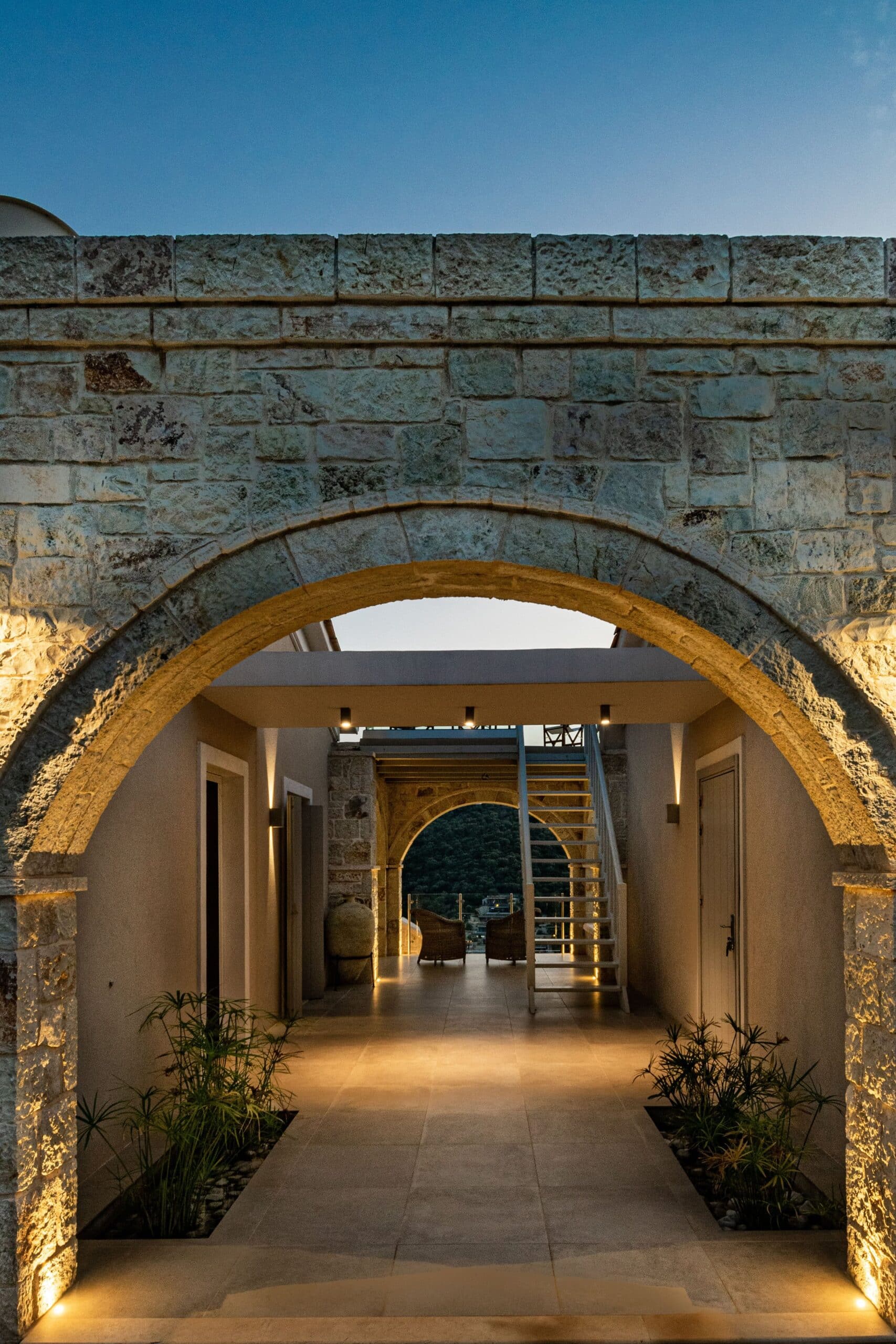Occupying a secluding position high above the sea amongst the wooded hillsides, Aetheria inhabits a world all of its own. Sleeping ten across five bedrooms, the architecture nods to traditional island buildings with lofty beamed ceilings and exposed stone walls. There’s the living area, whose sofas and armchairs are gathered around a fireplace– and huge sliding glass doors lessen the distinction between interior and exterior spaces. Al fresco life revolves around the panoramic pool terrace, which is magnificent: set right in the middle of the infinity pool is a seating area and sunken fire pit. From here, it’s a short walk to the pool bar. Beyond the terraces framed with stone walls, is the owner’s estate which includes vineyards and the stables, which house the rare horses, including the golden Akhal-Teke from Turkmenistan (the oldest surviving equine breed and one of the rarest). The villa can arrange horse riding for guests. But just don’t expect the Akhal-Teke.
