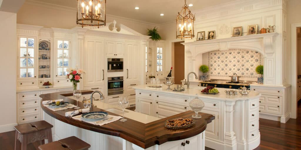 My favourite Clive Christian Furniture project was (surprisingly) the smallest kitchen I have ever designed! My client, Jeff, purchased the house and land behind his home and wanted to build a lovely garden that led to a guest house to be used when his family came to town. Since this kitchen would have light usage, we were able to use beautifully lacquered Yew wood with inlaid marquetry and natural cherry countertops (even the drainboard!). The combination of white cabinetry against the Yew wood was magical. It was such a luxurious and cosy space for his favourite guests to wake up to and have a warm beverage.