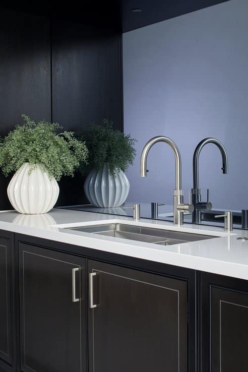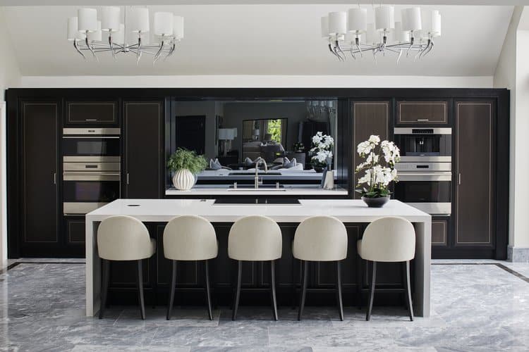 An exceptional backsplash and mirror instalment was created, which serves as a television when switched on to bring an alternative dynamic to the room. Switched off, it thrives as an elegant sink backdrop that draws together the wider room while complementing the natural lighting that reflects the garden pool and dances into the kitchen on warm, sunny days.