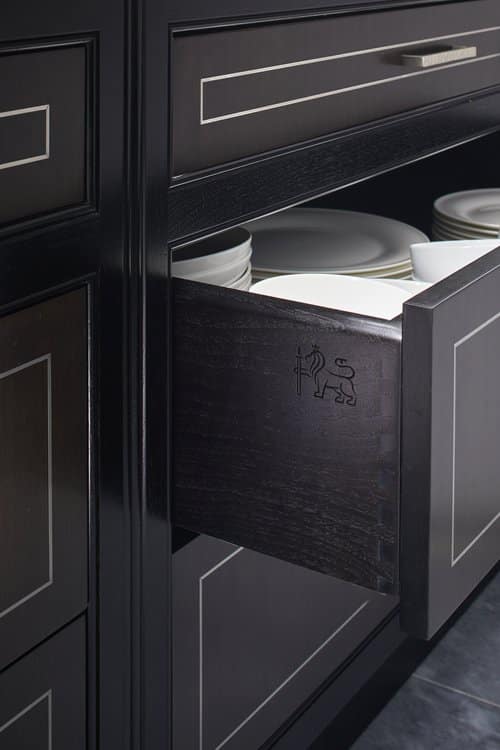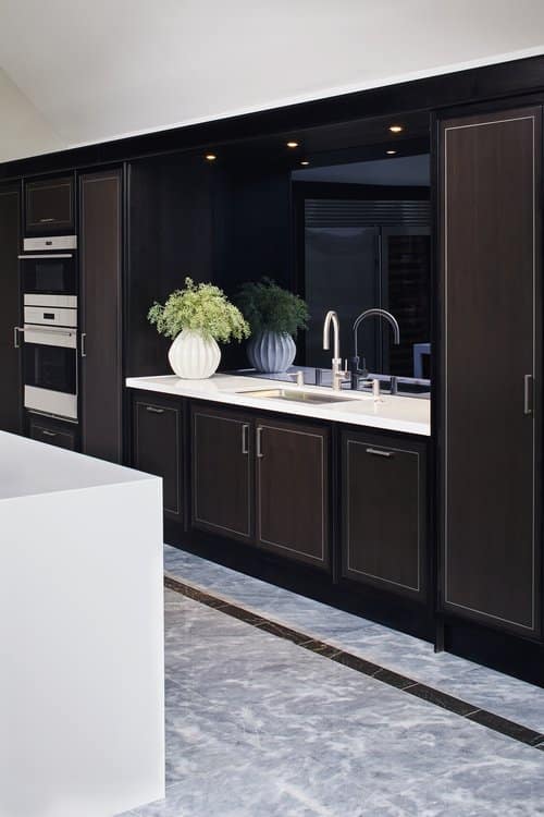 The black walnut aesthetics of the Metro Deco kitchen perfectly accents the kitchen’s artisanally made and signature Clive Christian Furniture cabinetry, which marries inlaid steel and ambient lighting to set a symmetric tone in the space.