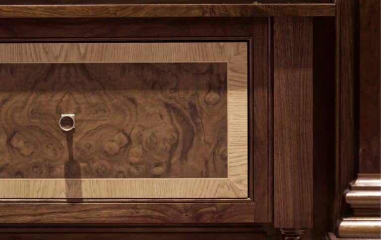 The exterior cabinetry features a rich sophisticated timber palate of walnut and oaks echoed throughout the interior. Notably the door, draw fronts and end panels feature a striking contrast design. Outer radial bands of crown cut oak are highlighted with an inner pinstripe of lemon satin wood and a central panel of Burr Walnut. The interior and the draws are lined with ‘delta blue’ leather, a playful coloured hide which nods to the Hästens iconic check.