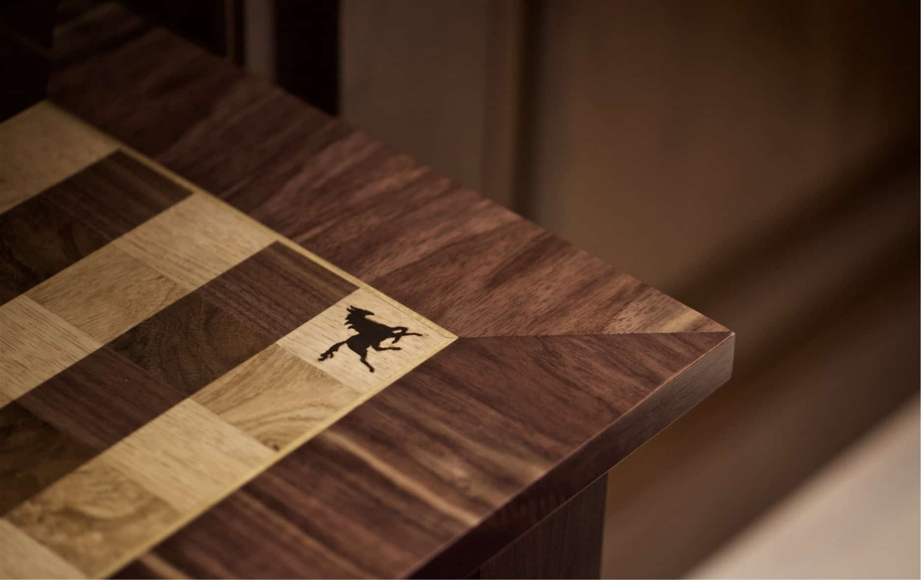 With this in mind we designed a chequerboard top using crown and burr cut walnut and oak timbers with a lemon satin wood pinstripe complete with a mini Hästens horse etched into the bottom right check to sign off the piece.