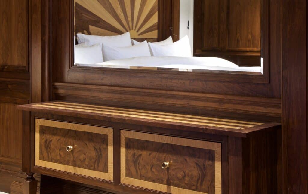 The headboard is the centre piece of any bedroom, and we wanted this one to be a true work of art. Immersing ourselves in the Hästens spirit, we knew that we wanted to include the iconic Hästens Horse – a nod to their heritage as they began life as saddle makers. We rested on the concept of ‘Dreamscape’ where each morning you wake to the vision of a Hästens horse galloping through a beautiful sunburst. Our expert marquetry team hand pieced each individual element of the design, using paper thin slices of precious Burr oak, walnut and pinstriped with striking lemon satin wood.